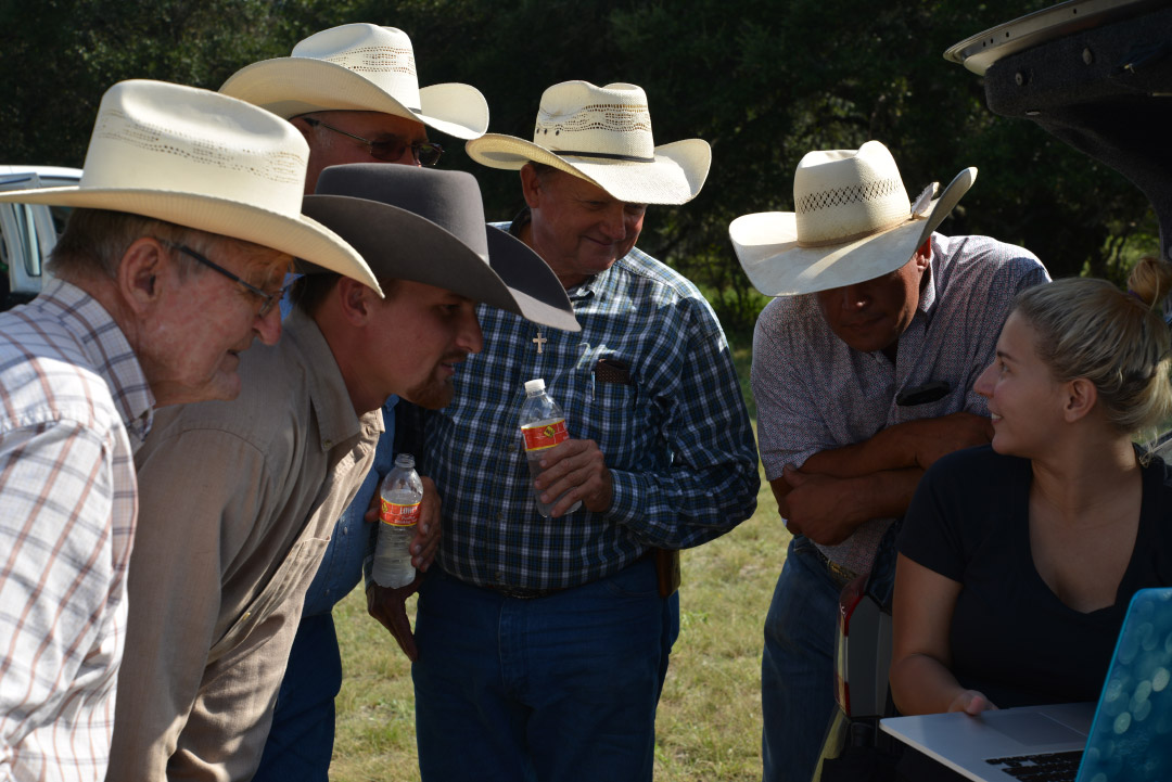 The ranchers gather to look at the drone footage.