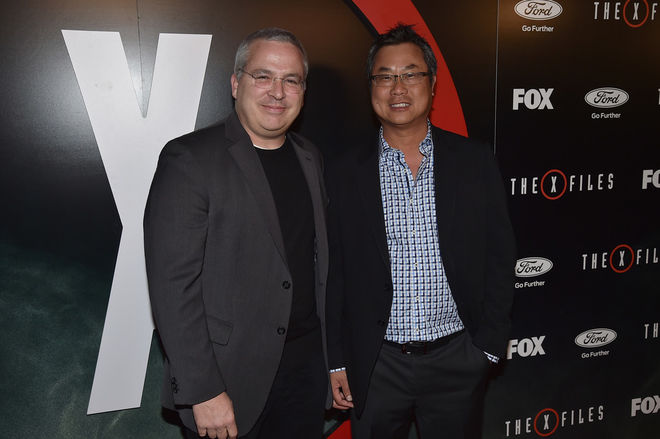 Glen Morgan and James Wong in 2016 at the premiere of The X-Files at California Science Center in Los Angeles, California.