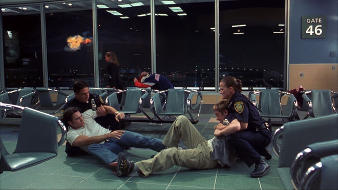 The moment of the Flight 180 plane explosion in Final Destination (2000) occurs while Carter Horton (Kerr Smith) and Alex Browning (Devon Sawa) are having a scuffle inside the airport