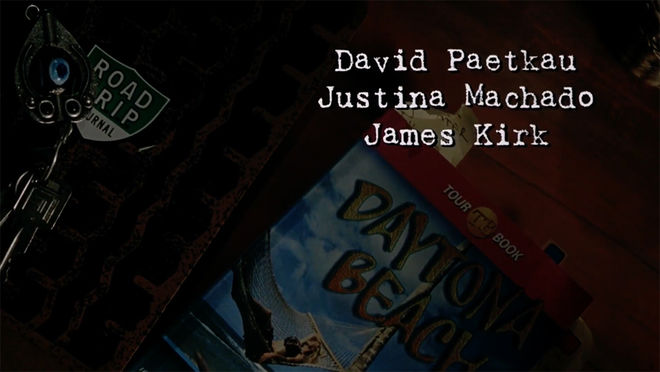 The camera pans through an array of objects as the titles fade in and out; a magnifying glass frames the tip of an X-Acto knife pointing at a photo of Kimberly while a travel journal is partially covered, its title reading “ROAD RIP”, a foreshadowing of the car crash. A toy airplane hangs above, calling back to Flight 180. The camera pulls back to Kimberly’s hand, which twitches in slumber like it’s seized with a cadaveric spasm.