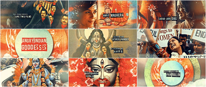 Angry Indian Goddesses is a film that holds an intersectional lens up to contemporary Indian society, taking an unflinching look at gender, sexuality, patriarchy, class, friendship, and all their pressure points. It’s a film bursting with colour and razor-sharp emotion, and so its opening titles must follow suit. The sequence, designed by Mumbai-based studio Plexus, weaves together images of the cast with protest photography and Indian deities in power poses. Likenesses of goddesses like Kali are ubiquitous in India, sold on cards and bookmarks, used in calendars, embroidered on fabrics and painted on walls. It’s surprising, then, that the opening title sequence was heavily altered for its Indian theatrical run. The original version of the sequence, before the film hit the Censor Board, is above – in all its glory.
