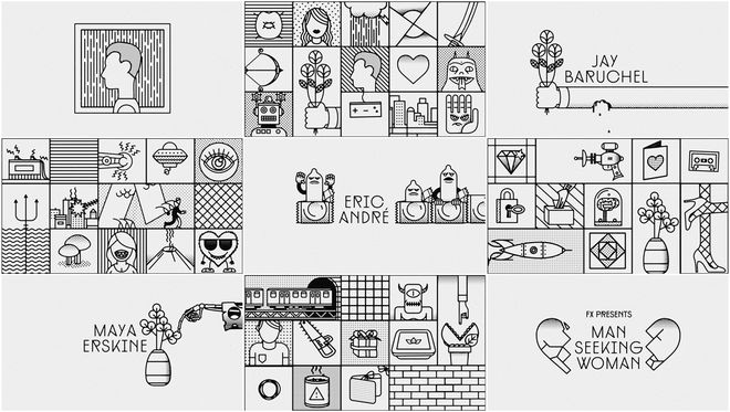 To convey that sense of romantic and manic whiplash, Digital Kitchen assembled the FXX show’s title sequence with a series of snappy black-and-white animations hurtling forward through an ever changing three-by-five grid. We get tidy little doodles of trolls, trains, and tridents; frowning condoms, wilting flowers, cassettes, skulls, and ray guns. It’s a giddy bit of nonsense that hints at Man Seeking Woman’s disparate, breakneck comedy.