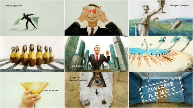 Telling the story of Anikeev’s fall from grace is the show’s stunning title sequence, created with brilliant oily brush strokes by father-son duo Alexandr Petrov and Dmitri Petrov. Most well known for their 22-minute film The Old Man and the Sea (1999) which was the first animated film to be released in IMAX and an Oscar Award-winner for Best Animated Short, the Petrovs revisit their paint-on-glass technique for Domashniy Arest's gorgeous one-of-a-kind opening. As Anikeev dances with an American one-dollar bill and men in suits engulf each other like morose nesting dolls, a smudgy and vibrant history unfolds. It’s a treat to watch each scene blend into the next, culminating in Anikeev’s metamorphosis into a lowly housefly, left to his fate in an empty room. Sweet justice. LL
