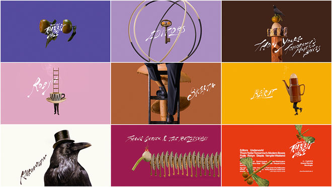 But if you are planning to take that kind of trip, then you’ll be positively chuffed to know that Down the Rabbit Hole continues to enlist the talents of the Brothers Hos – Merijn and Jurriaan – to create the promotional material for the festival, including the surreal title sequences that have launched successive editions of the event. Expounding upon their previous work with increasingly bizarre and captivating results, the Hos’ organic circles and 3D spheres have given way to strange creatures formed out of everyday objects and body parts. Hands without arms and legs without bodies combine with vases and vegetables to become odd beings. Insects with spinach wings? A raven in a tophat? A teacup with legs?! Why not? Inky type hovers about like smoke, rippling in space as the beasties march by. Is it all just weird for the sake of weird? Sure, maybe a little. But if you’re attending Down the Rabbit Hole with Thom Yorke and 10,000 new friends then it’s exactly the sort of charming peculiarity that’s going to make your festival experience all the more enjoyable. WP