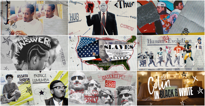 Perhaps most well-known as the ex-49ers player who kneeled during the national anthem at NFL games in protest of racial injustice, Kaepernick's voice flows throughout the series to ground it in his personal experience. The show’s minute-long intro montage was created by studio Elastic and is set to Kendrick Lamar’s thumping track “DNA.” It folds together elements of the former quarterback’s life as well as clips of music videos, TV series, other athletes, politicians and historical events. As NPR’s Eric Deggan notes, “Kaepernick sets the tone early, speaking ominously while visual images morph from Black professional athletes examined by white coaches and team doctors to slaves getting a once over from white men selling them at auction.” Co-created with Ava DuVernay (Queen Sugar, 13th), the series makes crystal clear what it was like for Kaepernick as a young biracial man growing up with white parents while struggling to determine his identity and how these experiences shaped the principled activist and football star he would become.