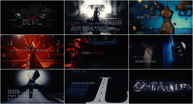 Behind this typographic artistry and the film’s main-on-end sequence is creative director Lisa Bolan (Queen Sugar, Yellowstone, Carnival Row) and the team at studio Elastic. Set to Florence Welch’s seductive vocals and the bespoke number “Call Me Cruella,” the closing titles are a series of CGI vignettes featuring flashes of light and folding chairs, gilded moths and mannequins, crimson crepe and catwalks. “This was as epic as the main character is,” says judge Dorca Musseb. “It told us exactly who she was and what she was about. The visuals are absolutely stunning.”