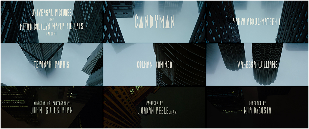 The film’s opening title sequence is also remarkable. With foggy, ominous sweeps through Chicago’s skyscrapers as seen from below, the opening literally turns the original film’s introduction on its head. While the 1992 film begins with an aerial view of the city during daytime, this one builds fear from the ground up, creating a sense of unease by upending a familiar view and moving from light to dark. The opening also benefits from custom typography created by Manual Cinema based on the original film’s titles. The credits were hand-cut and then backlit and photographed. Studio Filmograph then combined these elements, placing the titles onto footage and creating the projection-room end credits sequence. Altogether, the combination of elements is effective and singular — stunning old-world effects for a truly modern work of art. Sweets to the sweet.