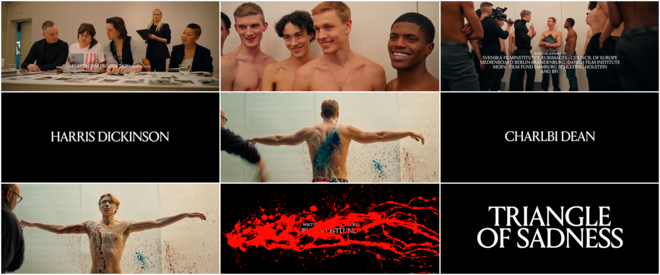 “Can you relax your triangle of sadness?” one casting judge asks. “Like between your eyebrows here? A little bit more. And open your mouth so you look a bit more available.” Carl does what he’s told. He walks. He looks a bit more available. The models wear swimming briefs bearing an American flag motif as they're hosed down with red, white and blue paint, the track “Born Free” by M.I.A. blasting. Bare-bones minimalism and chaotic excess are smash-cut together. Credits designed by Albin Holmqvist appear in flashes of white text on black.