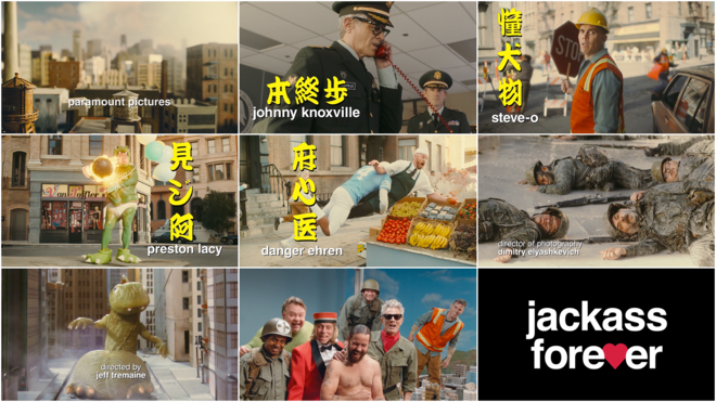The sequence is ostentatious, a hilarious mix of stunts, miniatures, stop-motion animation, and CGI wizardry that is at turns artful and awful, meticulous and messy. Cameos abound from actor Alia Shawkat and director (and Jackass co-creator) Spike Jonze to Rams cornerback Jalen Ramsey and skateboarder Tony Hawk. Full of groaners and boners, the title sequence is a microcosm of Jackass as a whole, reminding us that tragedy is comedy and pain is inevitable but humour is always an option.