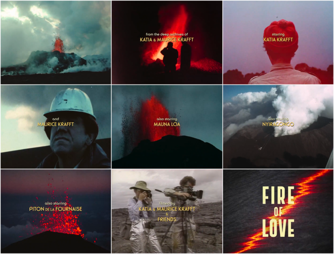 The title sequence, with typography designed by Kara Blake, introduces the film’s stars: Katia, Maurice, and the volcanoes Mauna Loa, Nyiragongo, Krafla, St. Helens, Piton de la Fournaise and Una Una. “I love, love, love everything about this one,” says Top 10 judge Bee Grandinetti. “How the narrative is constructed, the song, the edit, the credits, the fact that they list the volcanoes as characters in the movie. The personality and charm is so captivating!”