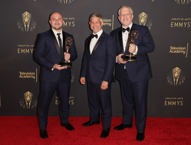 Eduardo Guisandes, Efrain Montanez and Jerry Torgerson pose with the award for Outstanding Main Title Design for The Good Lord Bird at Microsoft Theater on September 11, 2021 in Los Angeles, California.