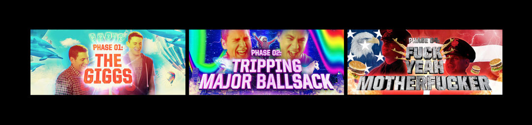 The drug phases were crazy! They were so much fun to work on and required such a different mindset. It felt like we were trying to forget the rules we knew regarding typography or techniques to preserve image quality, while playing with things like color correction and rotoscoping. I worked with some really talented designers on these scenes and we had a lot of fun discussing whether we should use a slice of pizza and a ninja or a handful of nacho chips and a rollerblade in the collage. These conversations sometimes felt ridiculous, but we knew that if they made us laugh, they’d make others laugh too.
