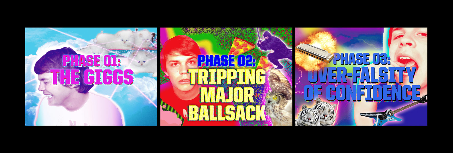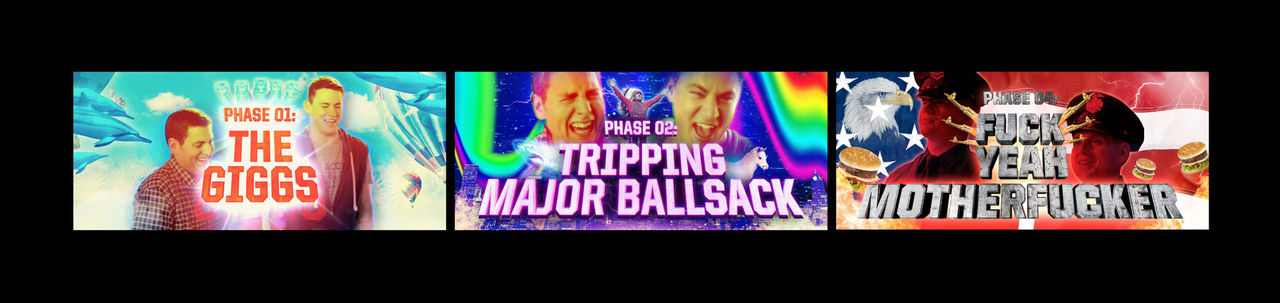 The drug phases were inspired by collage techniques, excessive Photoshop filters, and quirky typefaces. We tried to keep the imagery funny, random, and low quality, as though the high school student had downloaded these images from random sites at all different resolutions. We tried to play with pattern and texture while avoiding the instinct to over-design. These phases have two applications in the film: the moment in the YouTube video when you are first introduced to them, and then they are revisited later in what we called the more "cinematic" versions of the graphics, when the main characters take the drug. The cinematic versions were designed to take these basic principles and push them further.