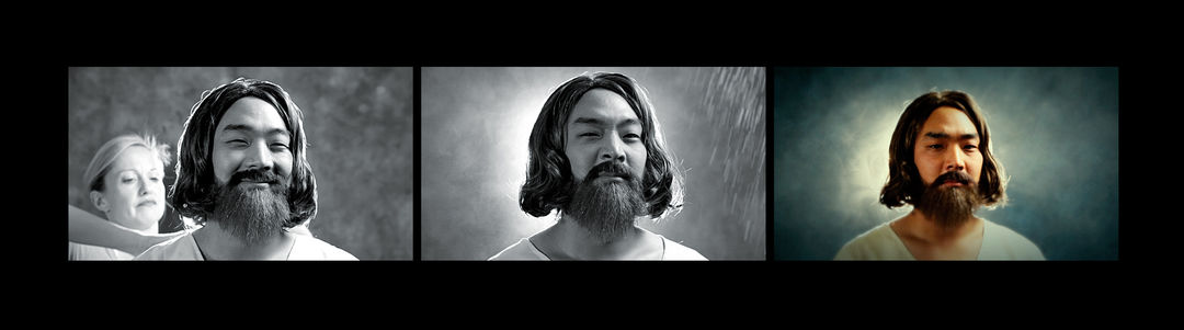 There is a hilarious moment in the film where Jonah Hill's character is praying to a statue of Jesus which looks of Korean descent – "Korean Jesus." It was so funny, we knew we had to work a reference to it into the title. One day I was talking with an assistant designer at IF, about the project and it dawned on me: I asked him, "Are you Korean?" He hesitated – he was suspicious – and he said,"...yes." Then a few days later we were in the lobby, shooting him dressed up as our very own Korean Jesus! He was a great sport about it; halfway through the shoot, I realized we should’ve rented a fog machine to give the shot a more ethereal atmosphere. A co-worker had some of that Gold Bond Medicated Foot Powder and he suggested that we stand at his side and sprinkle it into the air. The effect worked great!
