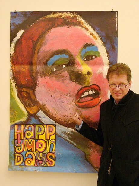 Tony Wilson, Factory Records manager, with the Happy Mondays Bummed poster in 2005.
