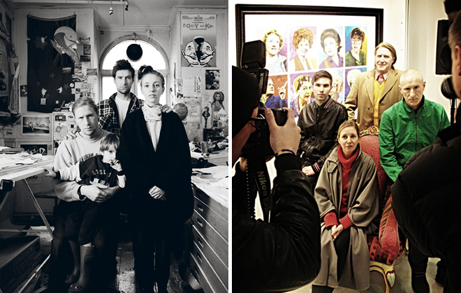 Portraits of Central Station in their studio in 1989 (left) and at their Coronation Street 50th Anniversary exhibition in 2010 (right). In the left photo, clockwise from top: Pat Carroll, Karen Jackson, Sam Carroll, and Matt Carroll.