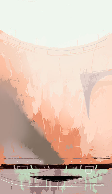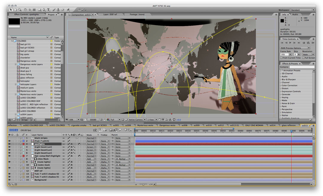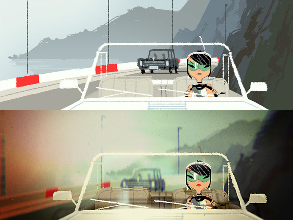 KD: What I’ve learned in working on these productions with Stéph is that my job is to give him a bunch of things to play with in After Effects. Whenever I make a scene I try to keep everything separated so that he can take any piece from the scene and do whatever he wants with it. Using Photoshop I painted as many layers as I could. Having the animatic allowed me to plow through.