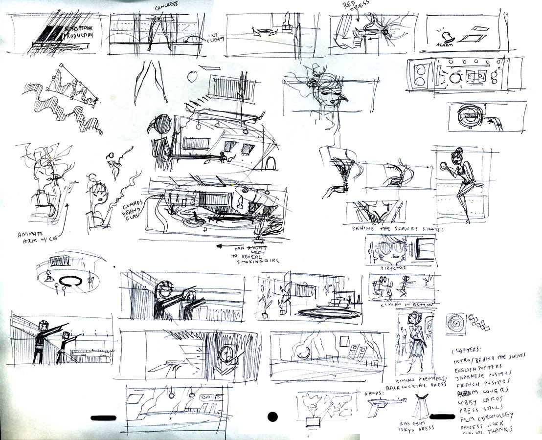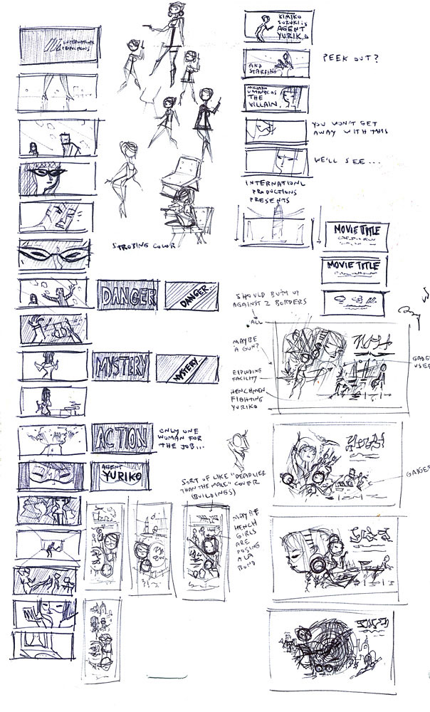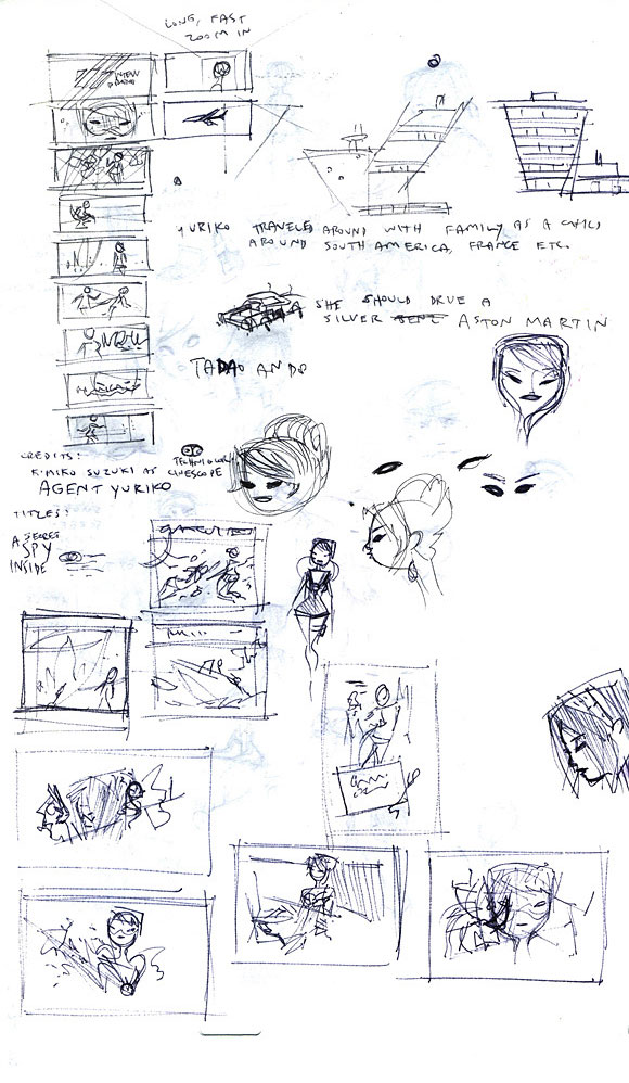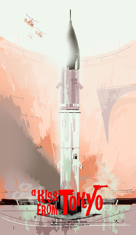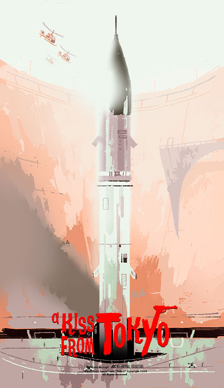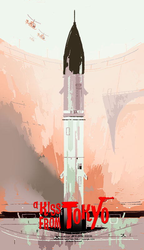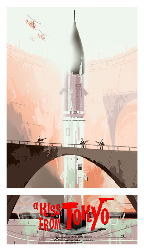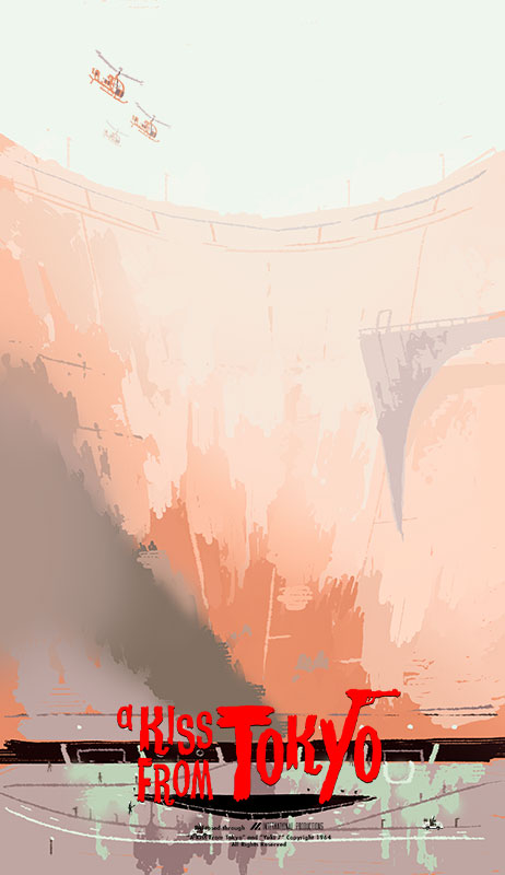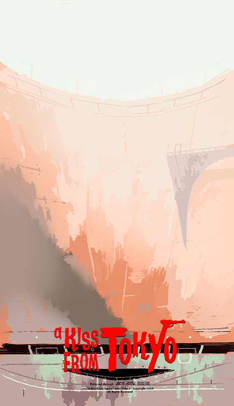 SC: He sent me a b&w rough storyboard. It was the very early stage, the title wasn’t yet A Kiss From Tokyo but The Secret Agent Girl of Danger Cove and Yuki 7 was named Yuriko. I first did a rough edit of the stills on a temp soundtrack to have an idea of the length and the rhythm of the whole trailer. I then did a rough animation test on the three opening shots of the trailer to show Kevin how I was going to treat the picture, and to see if we were on the same page about the overall feeling we wanted to give to the audience. He was really happy with it and then he produced a colored and layered version of the board with a slightly different cut and a new title and the finalized name of our secret agent girl. And then I started the big work.