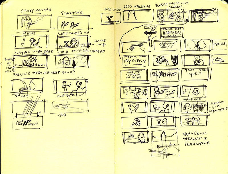 And there is a great European spy film called Deadlier Than The Male. So I was watching these movies and studying the compositions, especially Danger: Diabolik which has these amazingly composed scenes. I thought about what would capture the essence of the 60′s spy genre before thinking about the flow of the trailer. I thought the scene where Yuki is driving her car against the rear projection screen could be iconic. I wanted to do a close up of her eyes; there is something about that that came across as really pulpy. At the time these were random scenes. It wasn’t until later that I had to figure out how to string them together.
