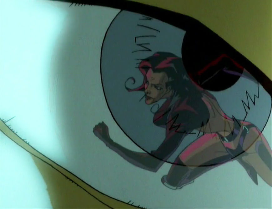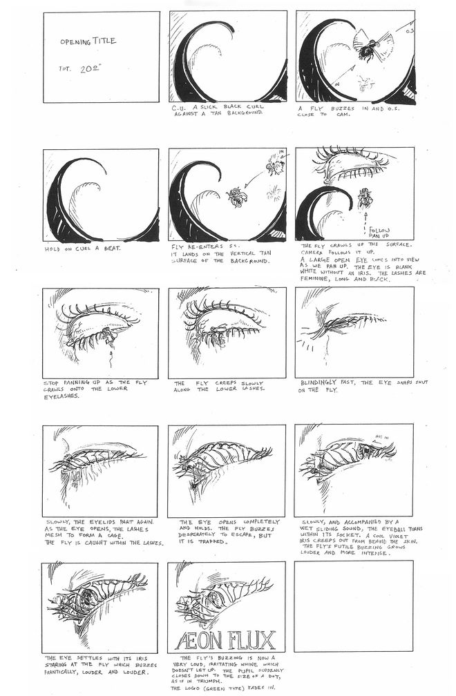 One of the most persistent themes throughout Æon Flux is that of surveillance and voyeurism; of the power inherent in the act of seeing and being seen, something which is represented in what is arguably the series’ most iconic image: an eye enveloping a fly between its lashes. What first inspired the idea behind that image?