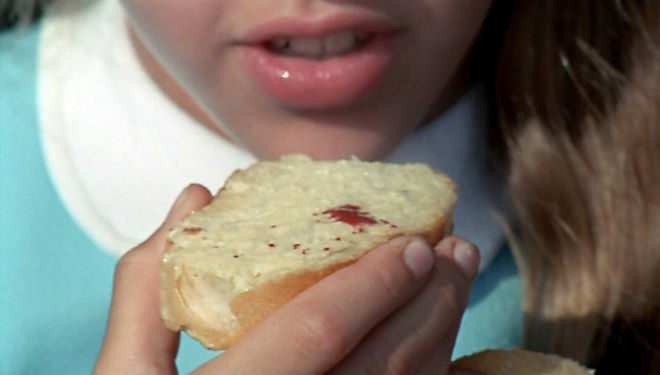 Still from a scene in Le Boucher (1970), directed by Claude Chabrol, in which a girl realizes the red spot on her bread roll is not jam but blood.