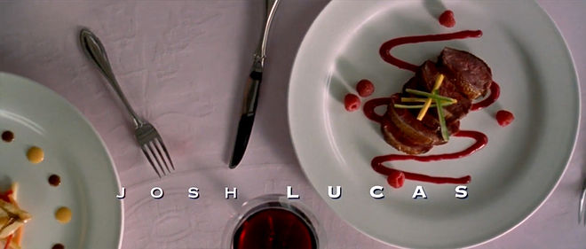 Stills from the American Psycho (2000) title sequence featuring food styling by Rick Ellis and Josh Lucas's credit