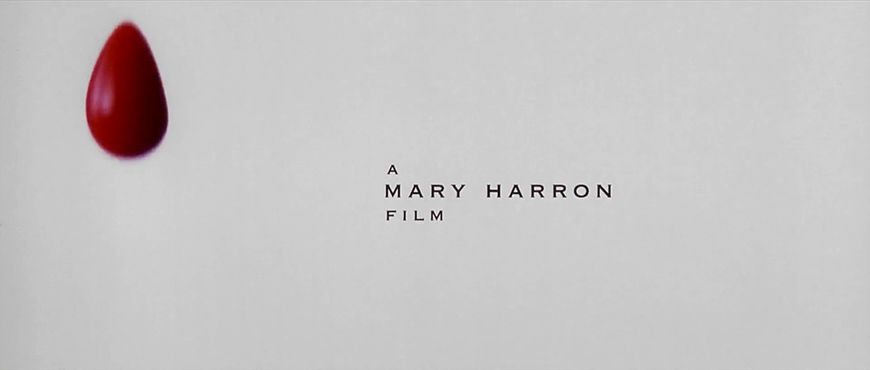 Still from the American Psycho (2000) title sequence featuring a drop of "blood" and Mary Harron's credit