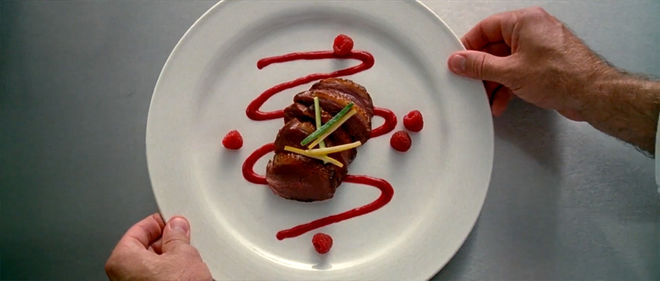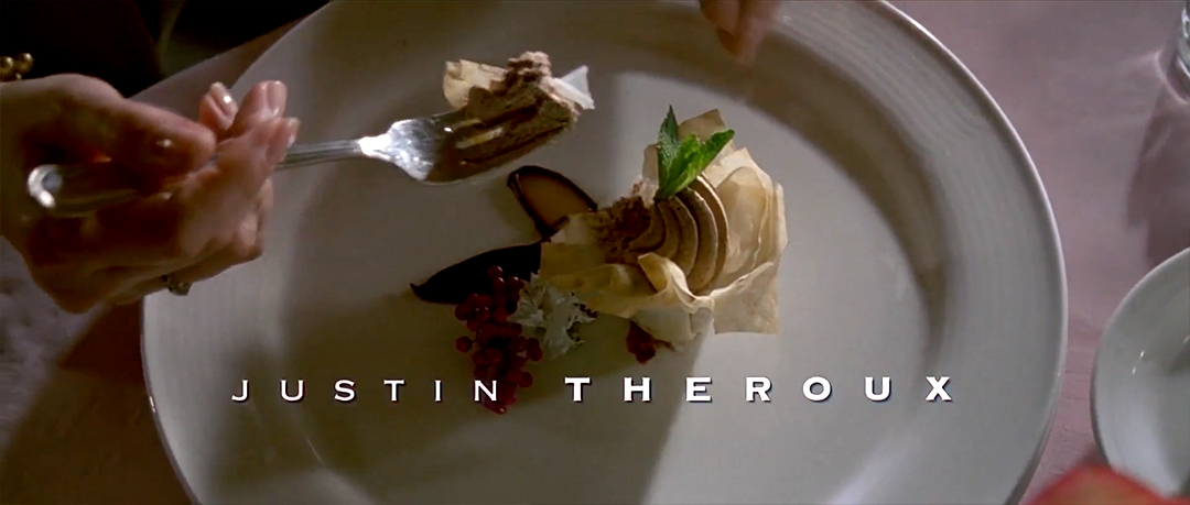 Stills from the American Psycho (2000) title sequence featuring nouvelle cuisine food styling by Rick Ellis and credits for actor Justin Theroux and actor (and screenwriter) Guinevere Turner