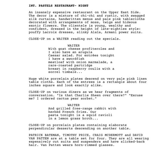 Excerpt from the opening of the script for American Psycho (2000), written by Mary Harron and Guinevere Turner