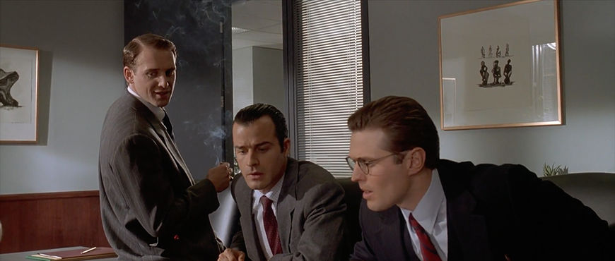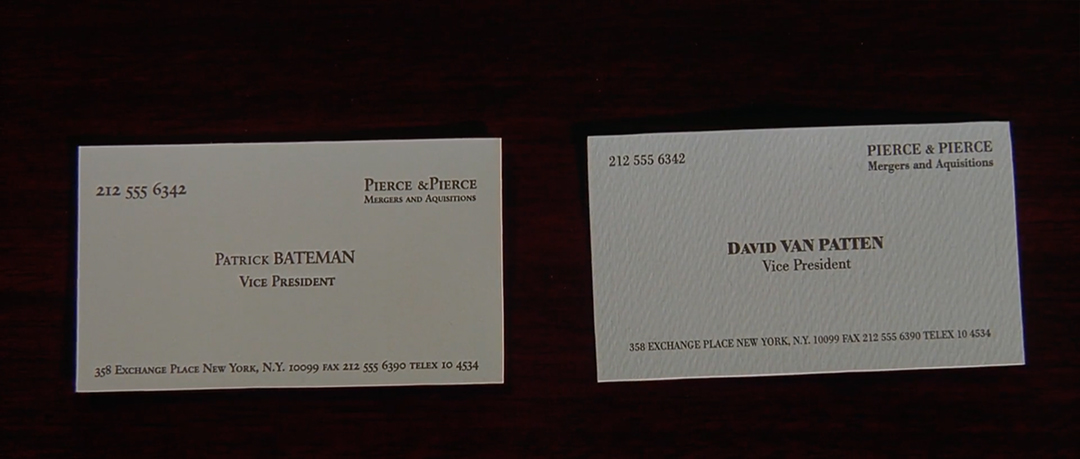 Still from a scene in American Psycho (2000) in which Patrick Bateman and his colleagues compare business cards