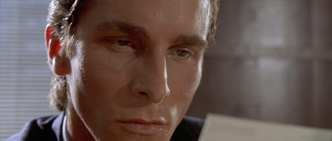 Still from American Psycho (2000) showing Patrick Bateman's reaction to Paul Allen's business card