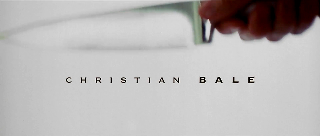 Still from the American Psycho (2000) title sequence featuring a knife and Christian Bale's credit