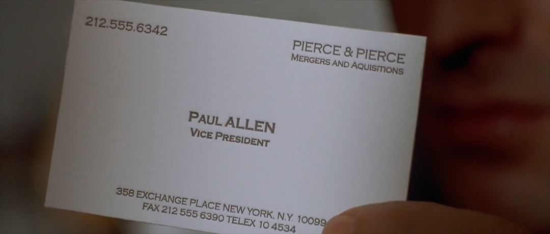 Still from American Psycho (2000) showing Paul Allen's business card featuring the typeface Copperplate Gothic