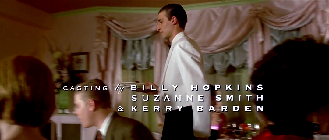 Designed by artist and activist Marlene McCarty, the credits are set in Copperplate Gothic, a typeface popular in the 1980s and often associated with authority, large institutions, banking and power. Staid and stacked, the credits are aligned to a grid and, like the plates of food, arranged in perfect balance. They appear either to the left, to the right, or just beneath the center horizontal line of the screen, not a hairspace out of place. A formal and crisp wedge serif, Copperplate Gothic was designed by typographer Frederic Goudy a century earlier in 1901. It has no lowercase characters, only small caps, and is often used by title designers because of its uniformity and barely-there-serifs which help maintain legibility at smaller sizes. The typeface appears in much the same manner – ominous, sterile, high class – in David Fincher's Panic Room.