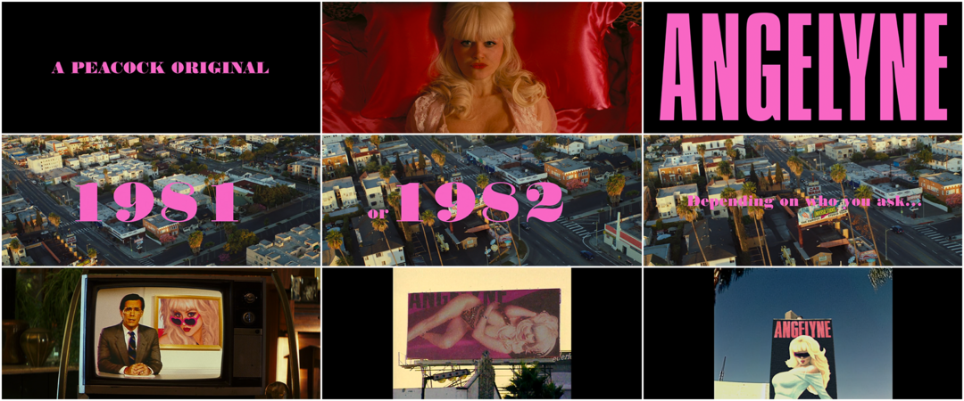 Angelyne S01E01 main title card Angelyne (2022) S01E01 end titles Credits Title Design: uncredited VFX Lead Artist: Todd Leykamp Music: "Evil Woman" by Electric Light Orchestra Support Art of the TItle Related 24 Hour Party People interview Almost Famous title only Devil in a Blue Dress summary Charlie's Angels summary A Woman Is a Woman title only Laggies summary