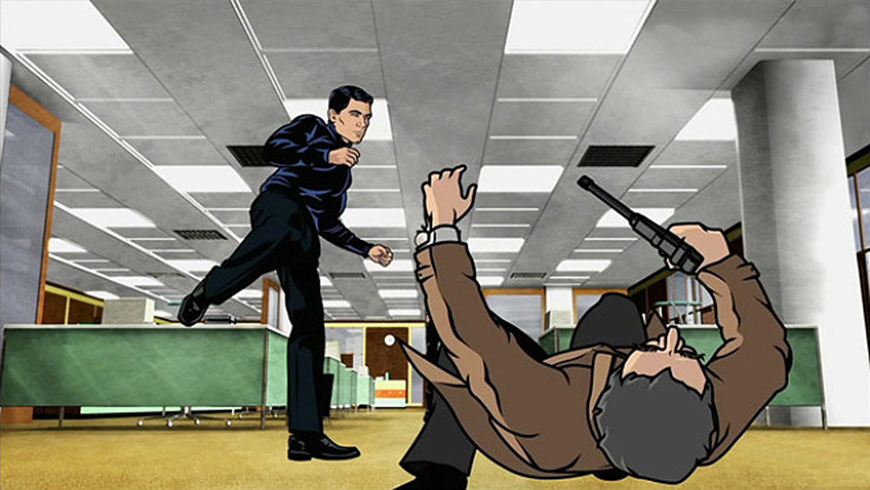 Judy Greer’s “heartbreaker” secretary Cheryl Tunt is shown with a heart-shaped locket, Amber Nash as Pam Poovey is operating a dolphin puppet, demonstrating her character’s commitment to anarchic references, Cyril Figgis (Chris Parnell) fiddles impotently with his cell phone, and Lana Kane (Aisha Tyler), Archer’s super-spy sometimes love interest, shoots her gun right at Archer himself. Arms raised and against the wall, the projectile prompts Archer to jump straight into his mother Mallory’s drink. He emerges “cleansed”, striking a James Bond-esque stance and regarding silhouettes of women arranged in provocative poses. The sequence ends with both Archer and the women he’s objectifying literally falling from their positions, as if the ground beneath their feet has given way.