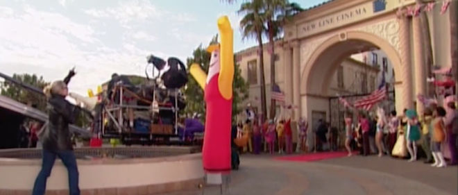 Jay: It’s this gigantic kitchen sink thing through the gates at Paramount with every possible kind of character. Little people, Lincoln on stilts… The stunt guy did – I tried to count them – I think he does almost a dozen handsprings and then does what we call a Texas Switch, when he ducks under the camera, and then Mike pops up right in front of the camera. He was standing on a crane at that point and the crane raises up into the sky and all that stuff is going on behind him, and there you have more animated graphic characters.