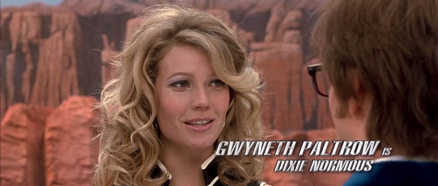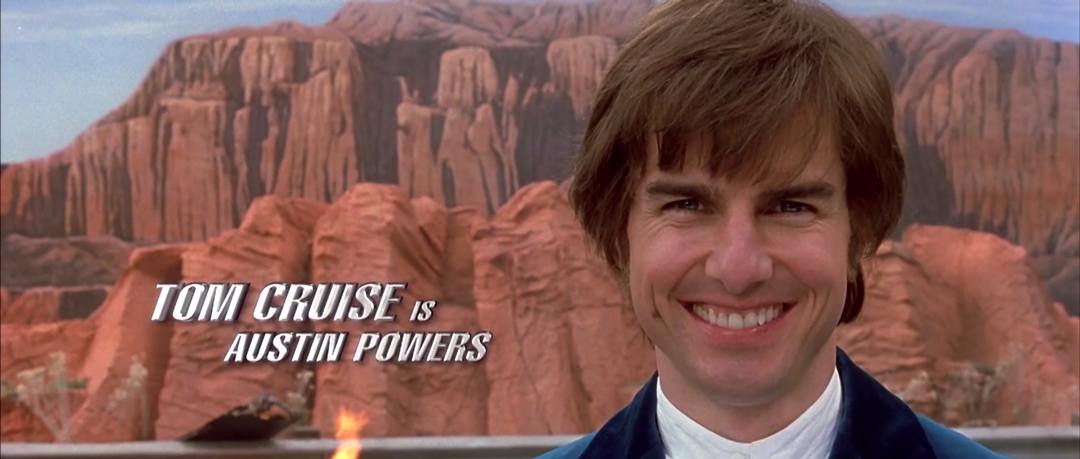 By this point in the Austin Powers universe, Austin is a worldwide sensation and Hollywood has come knocking, optioning his story for a star-studded, big-budget blockbuster called – what else? – Austinpussy. Thus, the opening to Austin Powers in Goldmember is a two-for-one experience – a title sequence within a title sequence – introducing both Tom Cruise as Austin Powers and Mike Myers as Austin Powers. The sequence begins with skydiving and stunts in the desert (a nod to Mission: Impossible II), shifts to a studio backlot featuring Cruise as Powers and A-listers Gwyneth Paltrow as Dixie Normous, Kevin Spacey as Dr. Evil, and Danny DeVito as Mini-Me, all hamming it up in pitch perfect harmony. The sequence then moves into the first of its three separate dance sequences, all choreographed by Marguerite Pomerhn Derricks. As with the second Austin Powers film, The Spy Who Shagged Me, the titles typography was designed by Robert Dawson. This time, thanks to the increased budget and visual effects, he is joined by title designer Simon Cassels, and together they give the credits a heavy helping of depth, sheen, and glitter.