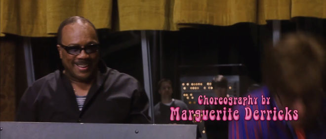 Still from the Austin Powers in Goldmember title sequence featuring "Soul Bossa Nova" writer Quincy Jones and the credit for Marguerite Derricks