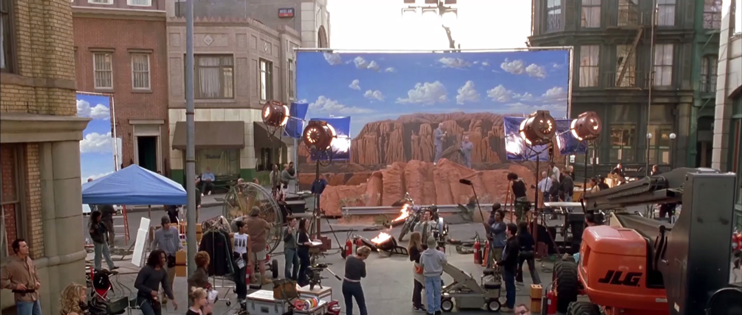 Jay: With Singin' in the Rain, and The Umbrellas of Cherbourg, that imagery and the colours on the backlot was amazing to us. That’s the idea that Austin would connect to a history of cinema by going through these backlots. The other thing is just breaking the fourth wall of the fancy Hollywood version and then going back to a less technical, less advanced cinema grammar. The magic of what people do on backlots…