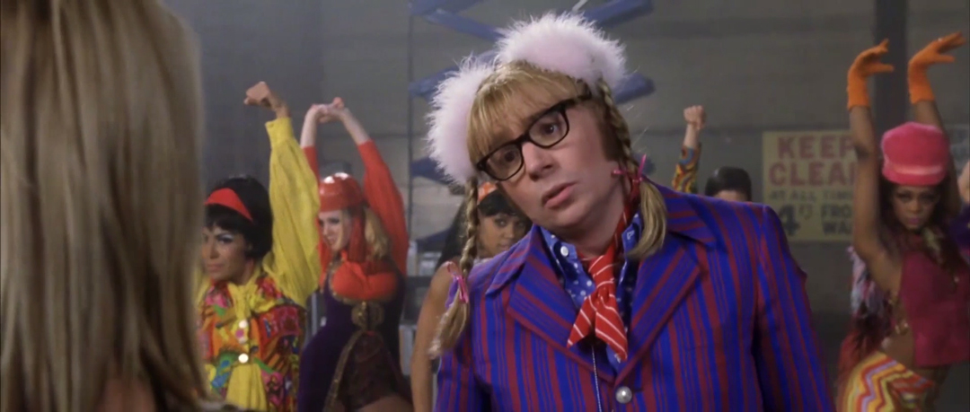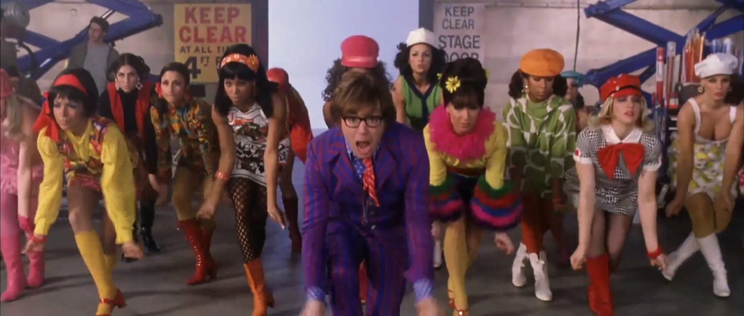 Jay: That gave us so much permission… I had been such a purist in the first movie towards a ’60s vibe that I never used digital opticals or steadicams or anything technological from contemporary times, in the late ’90s. I stuck with film techniques from the ’60s. So by the second one we were starting to be fancier, we had bigger villains, bigger Dr. Evil lairs on the moon, and it was starting to look pretty contemporary. By the third one, the idea was, let’s go even further towards contemporary to the point that it makes you nostalgic for the old ‘60s vibe. So the whole idea was to flip back after that Spielberg-directed sequence – quote-unquote – I mean, I directed that too but we wanted to make it look like Spielberg did. Then we flip back to the original eccentric dancing and Marguerite Derricks-style choreography and take him through this tribute to movies. Austin, because he was a recombinant DNA character, was always connected to movie history, so it gave us permission to go through all those different sets in the backlot. It was a pretty tight design – I was really happy with how that came out.