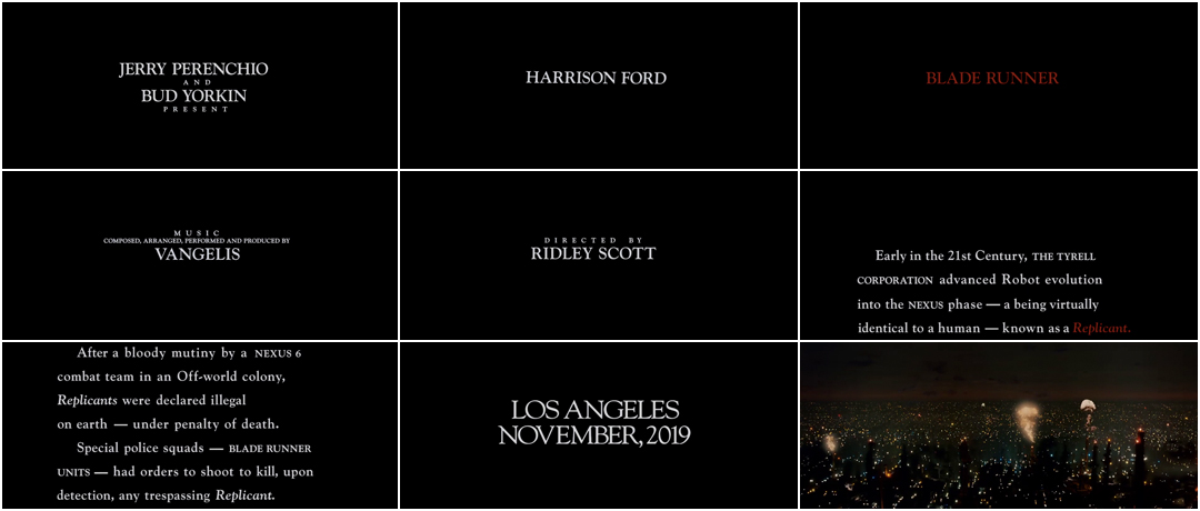 Credits Title by: Pacific Title and Art Studio Music: Vangelis Support Art of the TItle Related Alien summary Total Recall summary The Man in the High Castle interview Ghost in the Shell summary Akira title only Chariots of Fire summary