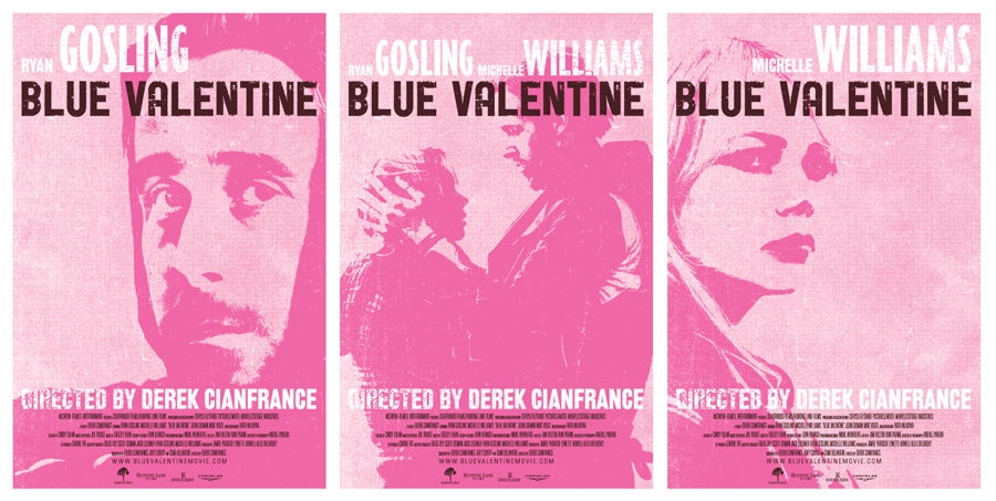 The fourth layer was the typeface created by artist and designer Chris Rubino, an amazing artist. Of course, I’m biased because Chris and I have collaborated on a film series called Love Kills Demons. We went through a serious exploration of typefaces, both curated and created by Chris. His interpretation of words is inspiring. A variation of the typeface that Derek, Chris, and I settled on is also used in the screen-printed limited edition pink Blue Valentine posters that Chris created for the Sundance Film Festival in 2010. Derek loved what he called the “like a Russian film” character of the small and large fonts. I love the boldness of the main title. Incorporating them into the picture was pretty simple... short fade in and long fade out, like exploding and disappearing light. The only title that cuts straight in is the main title, super bold with a long, long fade out.