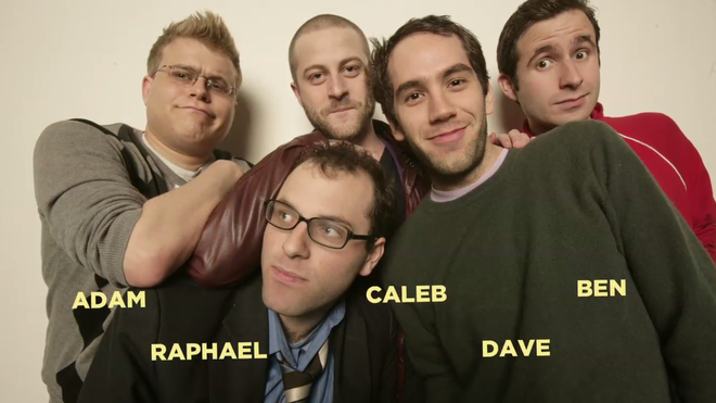 The Olde English sketch comedy troupe as featured in The Exquisite Corpse Project (2012). From left: Adam Conover, Raphael Bob-Waksberg, Caleb Bark, David Segal, and Ben Popik.