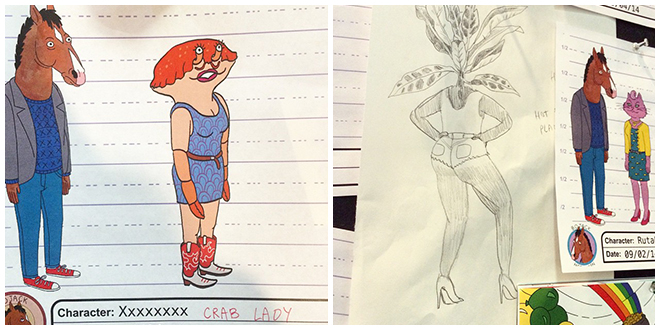Image Set: Unused character sketches by Lisa Hanawalt featuring Crab Lady (left) and Plant Babe (right)