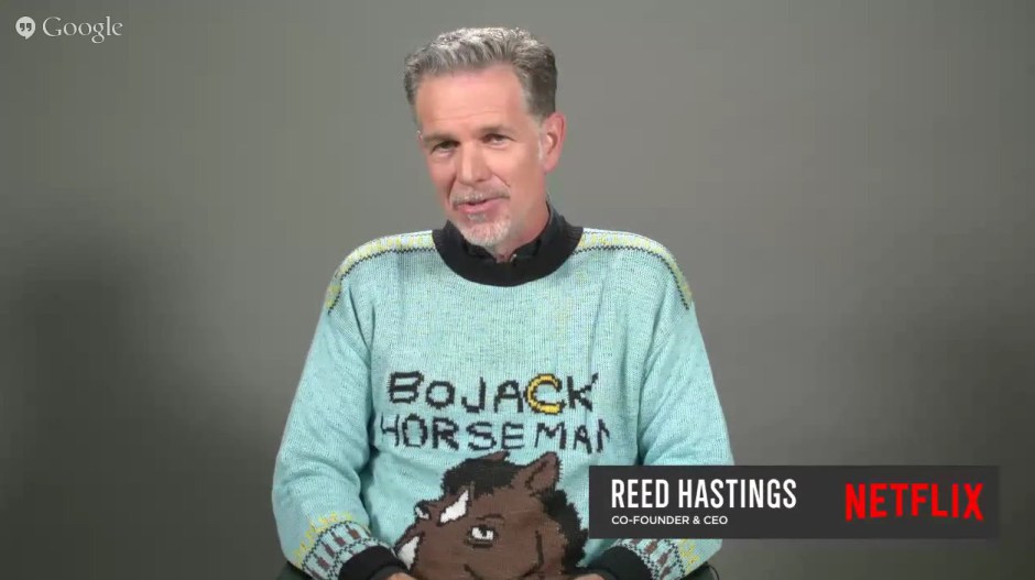Netflix CEO Reed Hastings wears an intarsia BoJack Horseman sweater in the company's Q2 2015 earnings interview