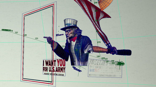 There are a few techniques out there for dimensionalizing 2D imagery, but we wanted to make this sequence more dynamic and bring the iconic works to life. Kaya and our designers worked with our 3D team to break down the posters into elements that could be mapped onto fully modeled geometry in Maya. We did three posters initially as a motion test. When we presented the animated 3D Uncle Sam and Handshake posters to Marvel, it was an easy sell.