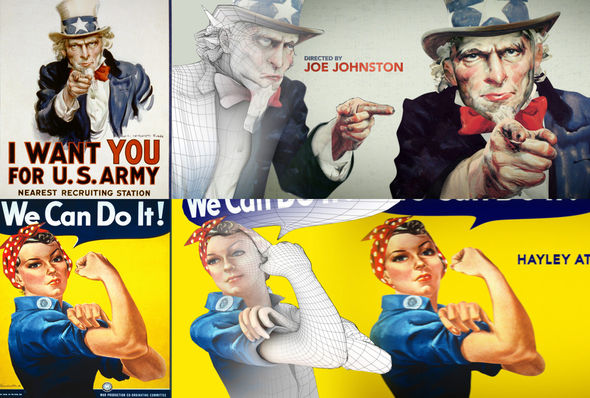 I pitched the idea of doing something similar to the black and white Nazi propaganda film Joe had used in The Rocketeer but with an American theme. The idea was well-received, and we started coming up with different ways the propaganda art could be used in the film. Originally it started out as an opening sequence, and our Art Director Kaya Thomas was developing some cool ideas based on propaganda that involved seamless transitions in and out of footage and artwork.