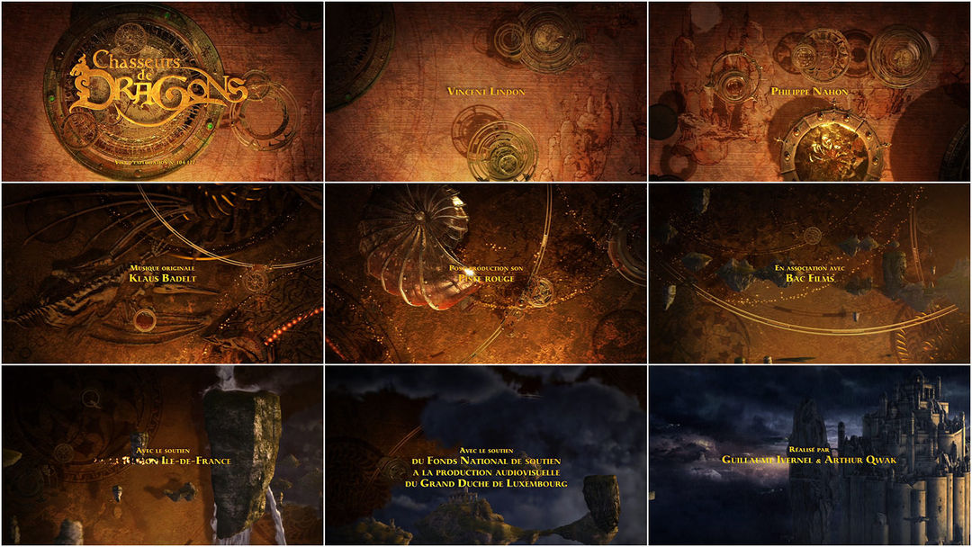 Created by Mac Guff Studios for Guillaume Ivernel and Arthur Qwak’s animated fantasy adventure, the title sequence to Chasseurs de dragons (also known as Dragon Hunters) is a steampunk wonderland, populated with intricate, animated clock components, foreign nautical contraptions, skeletal remains, and cartographic and cosmic imagery, all bathed in a warm firelight and explored by a single graceful camera move.