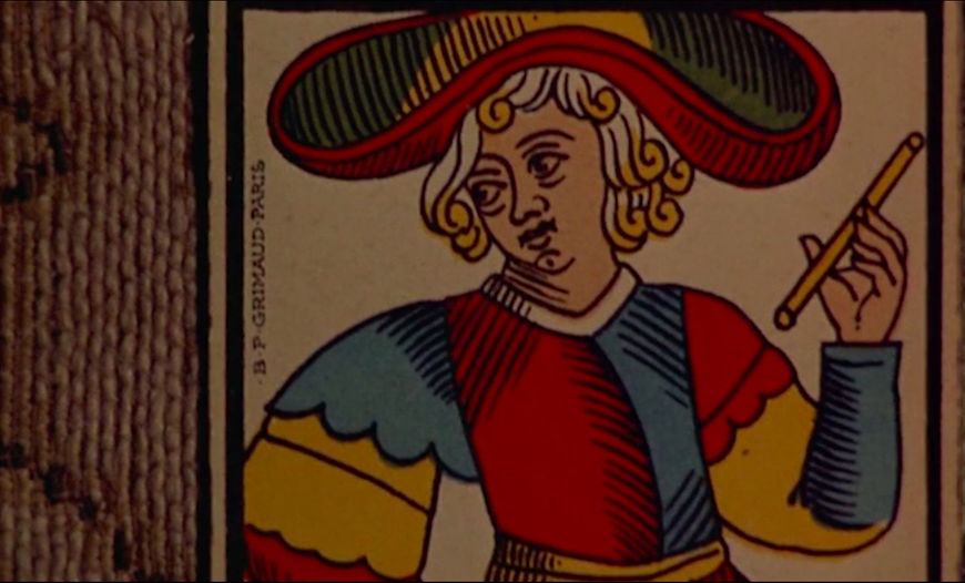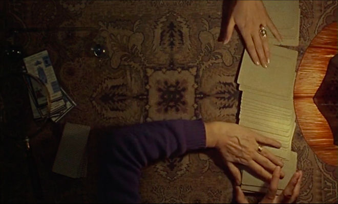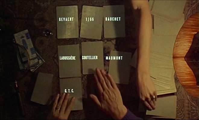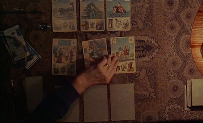 The eerie reading provides an overview of Cléo’s life – her career, lover, friends – as well as an idiosyncratic opening credits sequence, which, unlike the rest of the film, is in colour. It features an overhead view of a fortuneteller’s table with two pairs of hands moving around, their voices heard offscreen. The fortuneteller tells Cléo to cut the deck and choose nine cards.